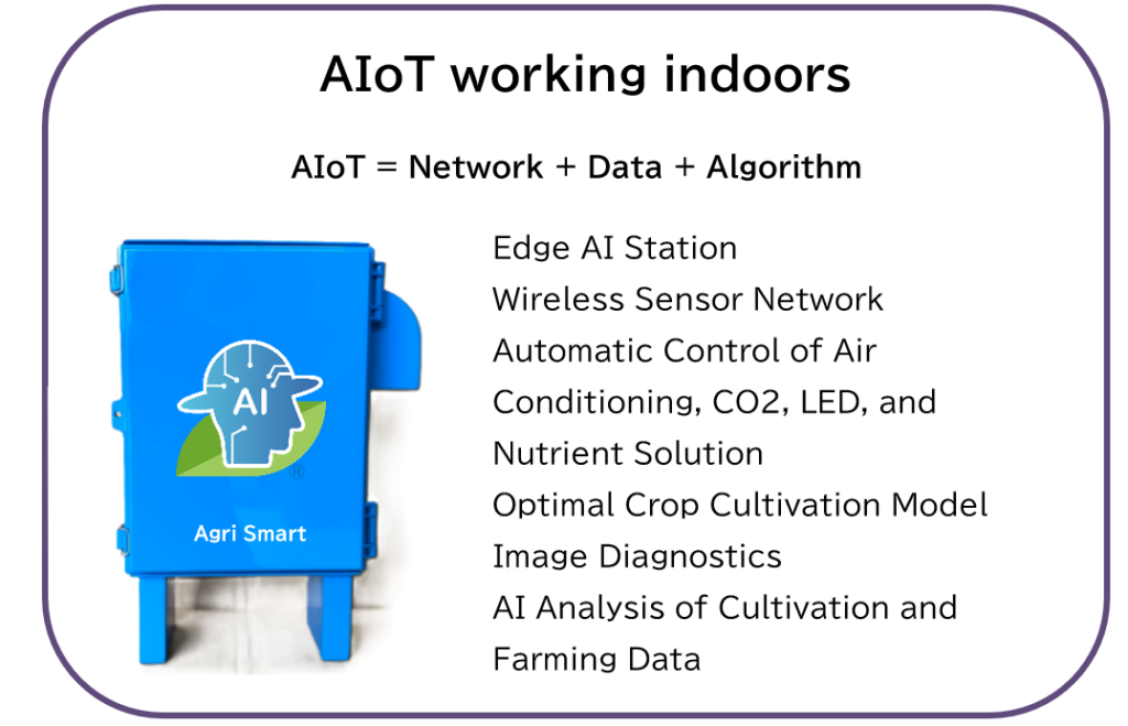 An AI Station is installed at indoor cultivation sites (edge), where observation data is stored on the edge, equipment is controlled, field data is analyzed, and optimal cultivation is achieved for each field.